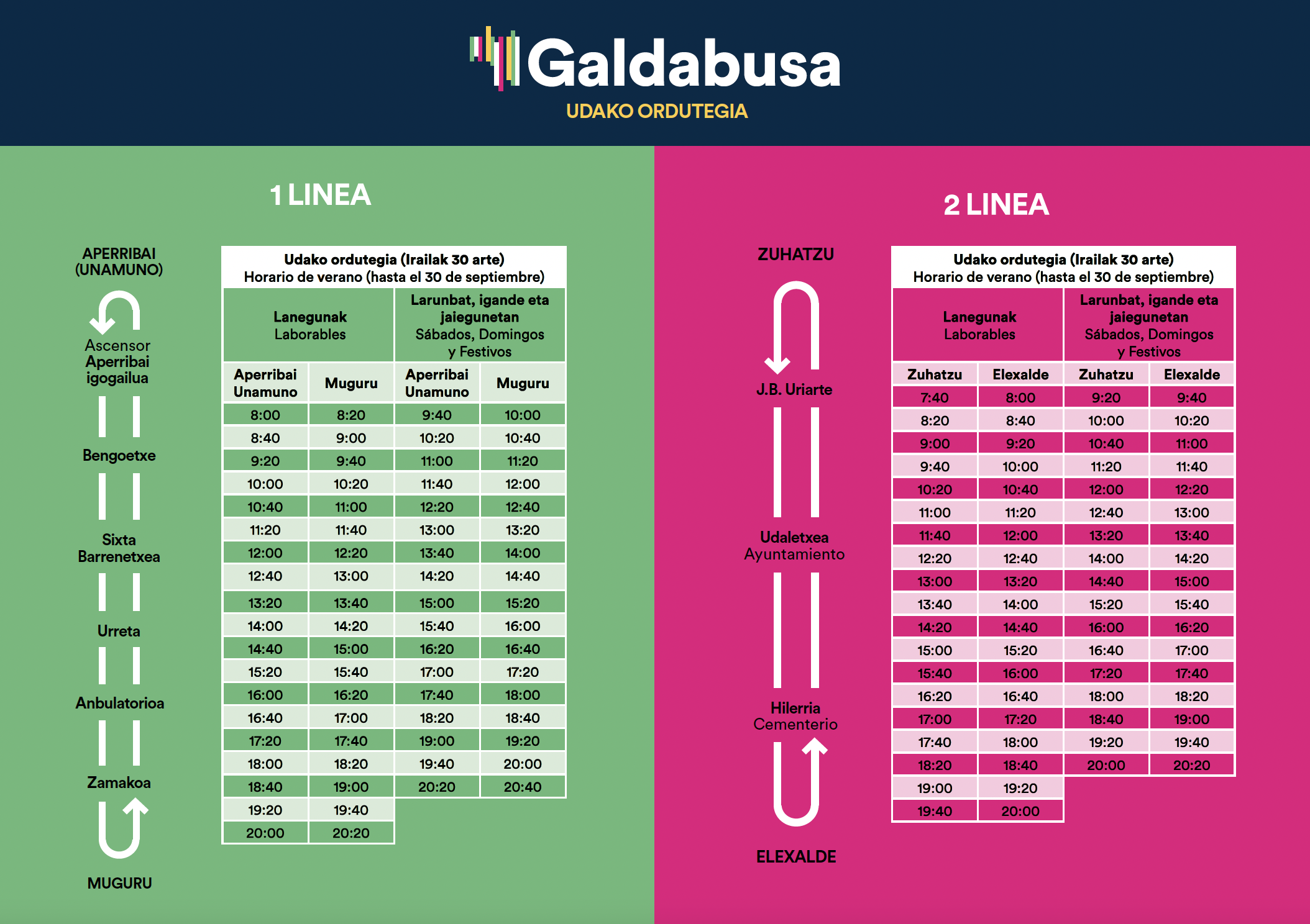 Galdabusak bi ibilbide izango ditu. Lehenengoa Aperribaitik Mugurura joango da eta hauek izango dira geltokiak: Aperribai-Unamuno, Aperribai igogailua, Bengoetxe, Sixta Berrenetxea, Urreta, Urretako anbulatorioa, Zamakoa eta Muguru. Ibilbide hau abuztuaren lehen astean jarriko da martxan.