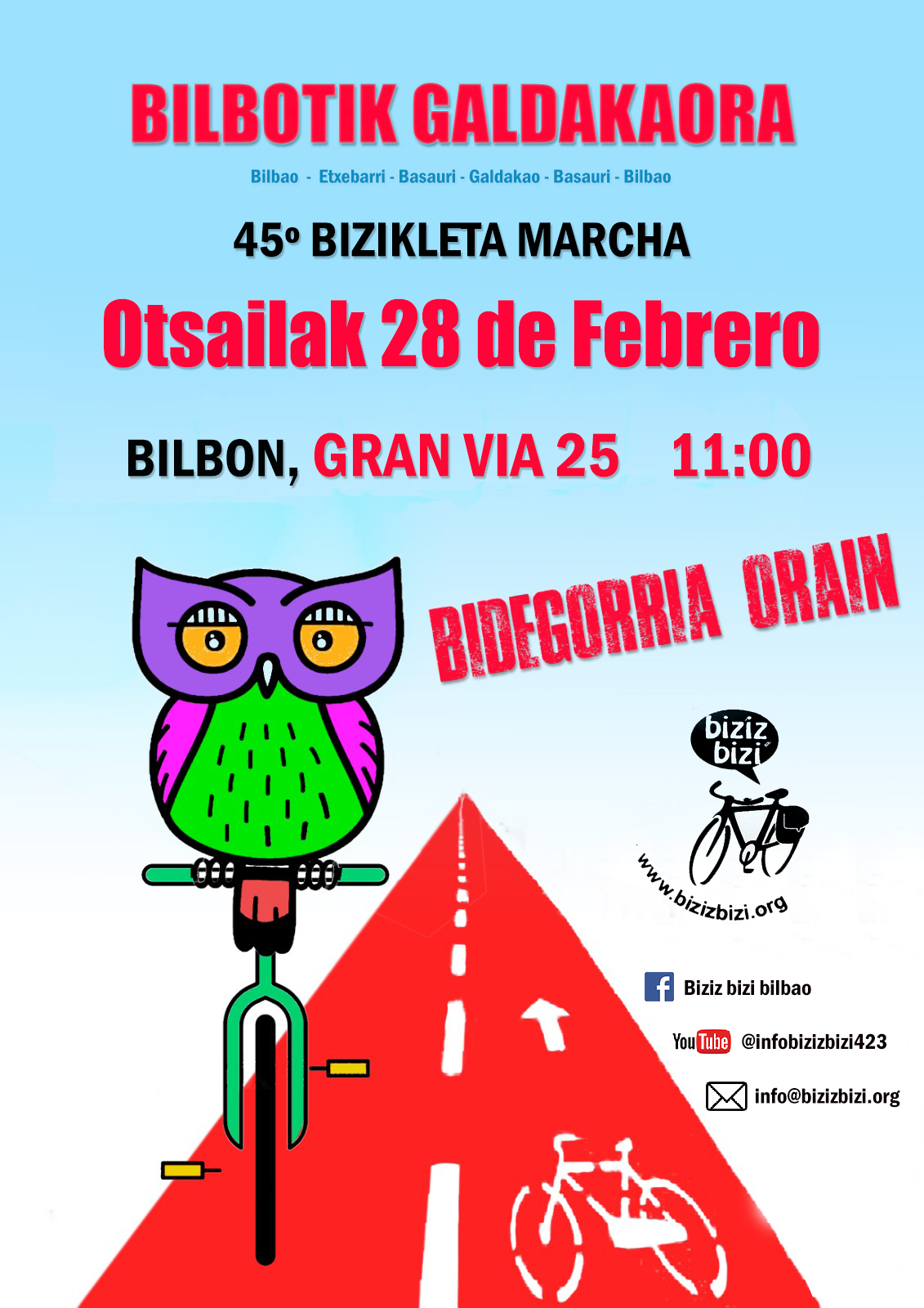 Bidegorria Galdakaora Orain martxaren edizio berri bat antolatuko du Biziz Bizi elkarteak bihar, otsailak 28. Ibilbidea 11:00etan hasiko da Bilboko Bizkaiko Foru Aldundiaren eraikinetik.
