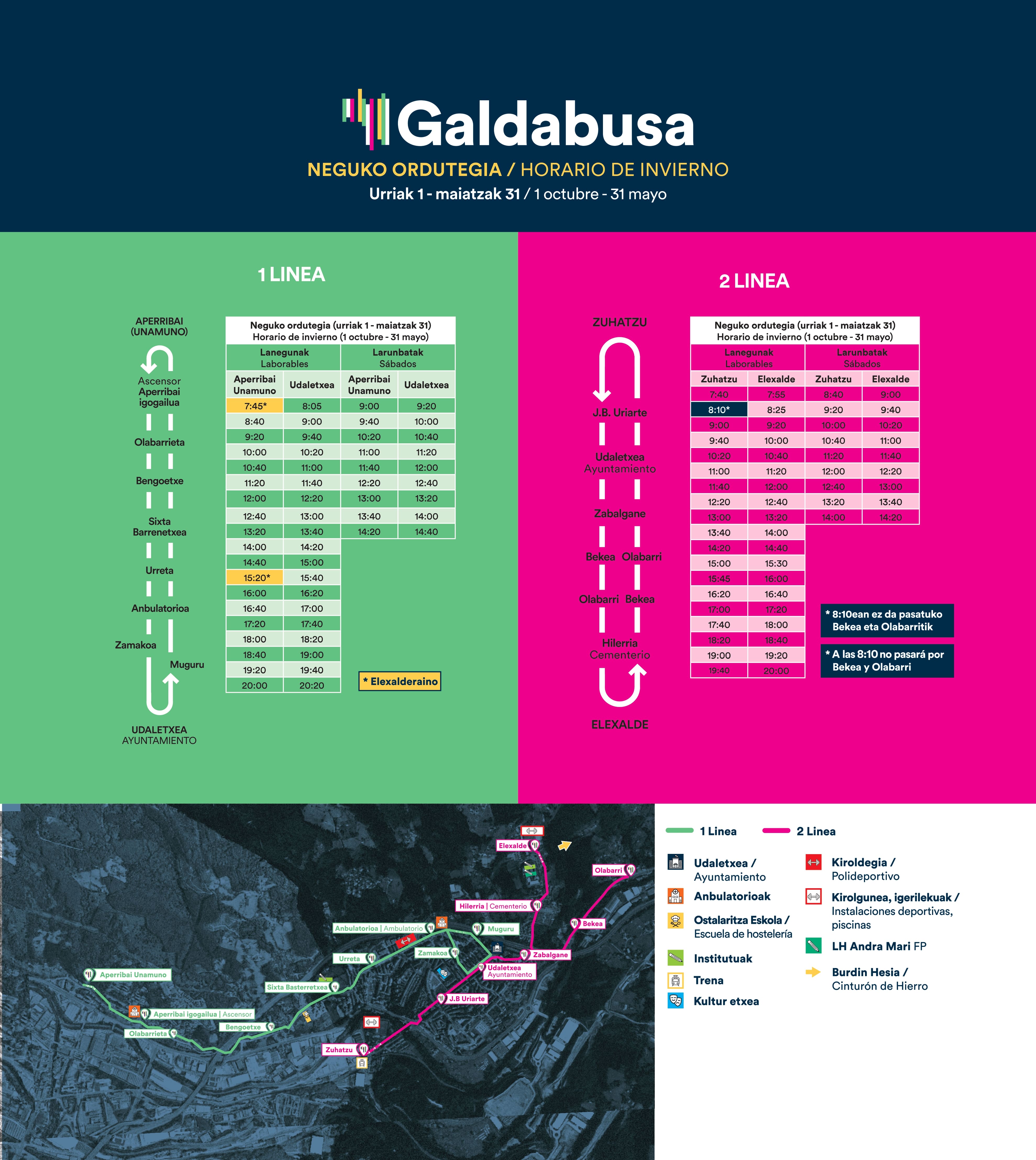 • 2. linean, 14:00etan abiatuko da larunbatetako azken autobusa eta 14:20an Elexaldetik. Larunbat goizetan, aldiz, lehenago hasiko da zerbitzua eta bidaia bat gehiago egingo du autobusak: Zuhatzutik lehen autobusa 8:40an abiatuko da larunbatetan, eta Elexaldetik 09:00etan. Igandetan eta jaiegunetan ez da zerbitzurik izango, salbuespenak salbuespen. Azaroaren 1ean, adibidez, Elexalderako zerbitzua egongo da, hilerrirako joan-etorriak erraztu eta autoaren erabilera gutxitzeko helburuz