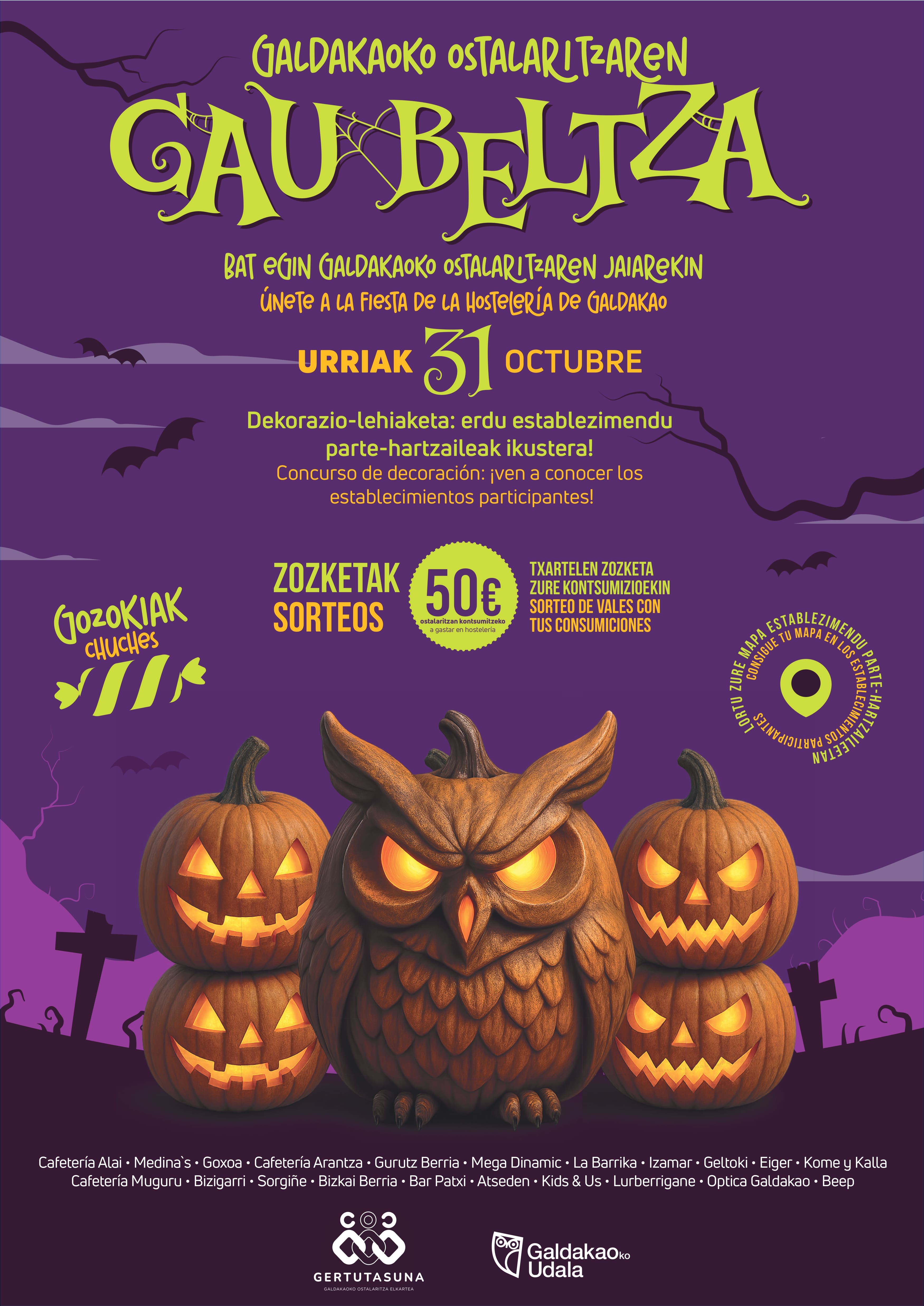Bihar, urriak 31, ospatuko den Gau Beltzarekin bat egingo du Galdakaoko ostalaritzak ere, Gertutasuna elkartearen eskutik. Besteak beste, ekimenean parte hartuko duten eztablezimenduetan egindako erosketa bakoitzak 50 euroko txartel baten zozketan parte hartzeko aukera emango du.