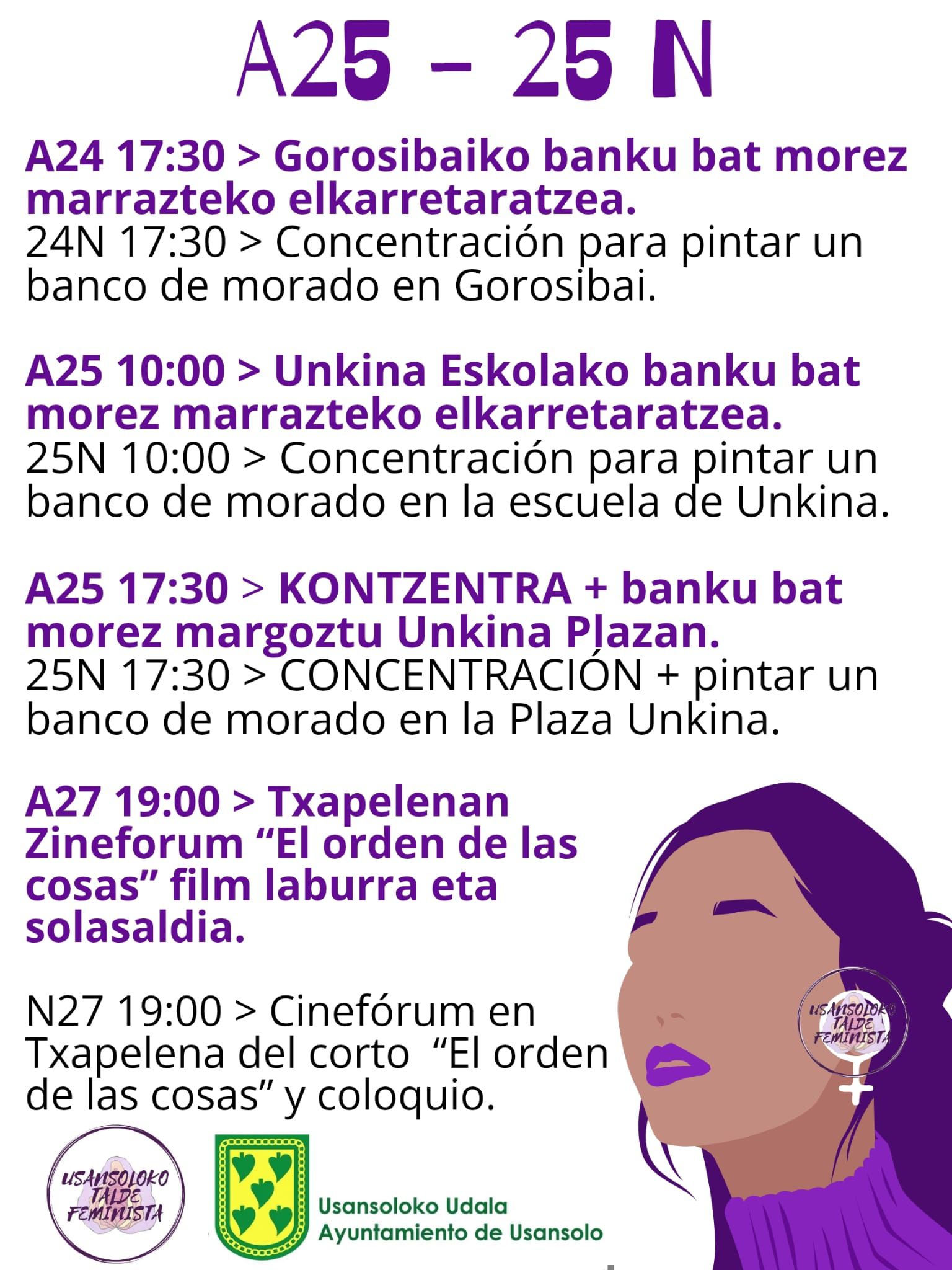 Azaroaren 25ean Emakumeen Aurkako Indarkeria Ezabatzeko Nazioarteko Eguna da eta Usansolok ere bat egingo du horrekin. Horretarako, bankuak margotzeko elkarretaratzeak, kontzentrazioa eta zineforum saioa antolatuko dituzte.