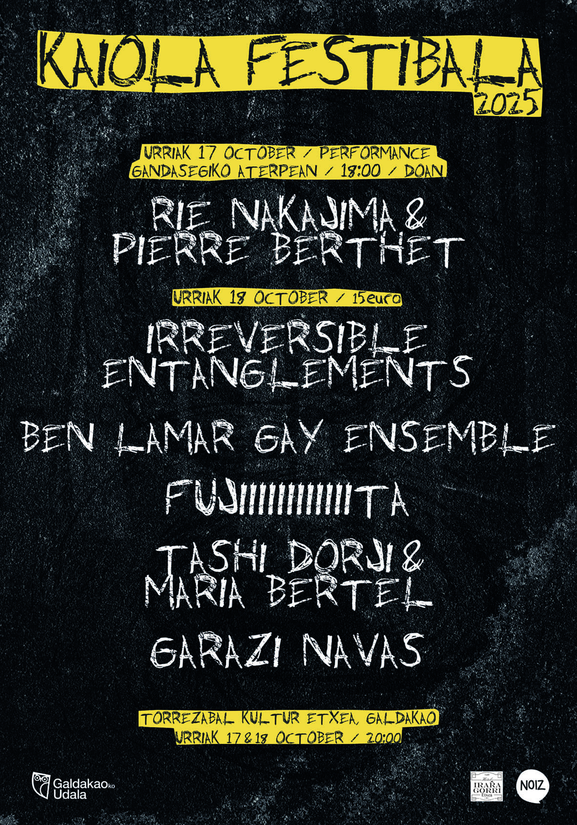 Bestalde, beste bost emanaldi eskainiko ditu zapatuan jaialdiak, kasu honetan Torrezabal Kultur Etxean. Hauek izango dira entzun ahal izango diren artistak: Garazi Navas, Tashi Dorji eta Maria Bertel, Fujiiiiiiiiiiita, eta Ben Lamar Gay Ensemble eta Irreversible Entanglements taldeak.