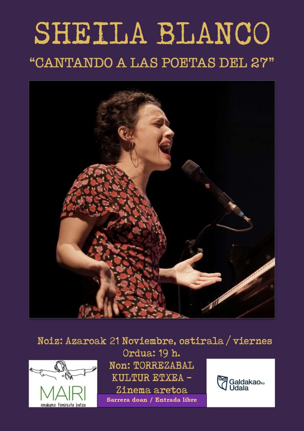 Azaroaren 21ean Sheila Blanco artistak ‘Cantando a los poetas del 27’ ikuskizuna eskainiko du Torrezabal Kultur Etxean. Mairi Emakume Feminista Batzak antolatu du saioa eta 27ko belaunaldiko emakume poetarik handienen poemak kantuetan bihurtuko ditu artistak.